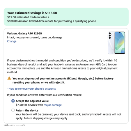 Edit/Update: I just chose my device condition as damaged (including broken screen) and it still is accepting my device with a reduced value ($115 total instead of $130. I tried attaching an image to this comment but its not showing up.)