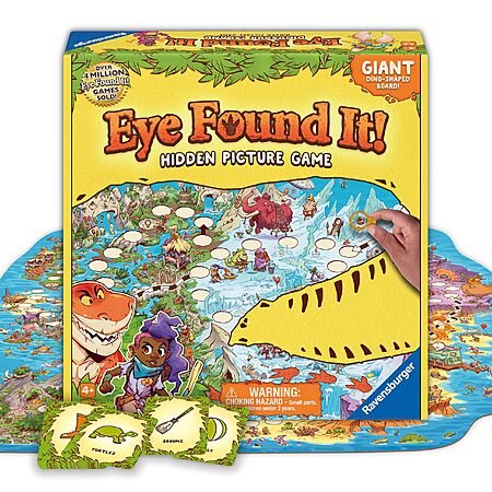 - Includes a 4-piece game board, dino adventurers, magnifying glasses, search cards, and a sand timer for interactive Eye Found It! search game play.