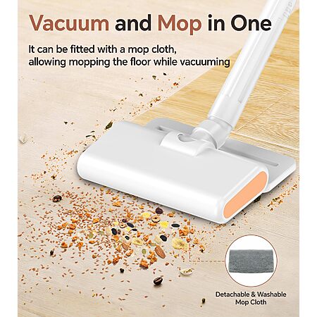 【Vacuum and Mop in One】The bottom of the cordless vacuum cleaner is fitted with an innovative fiber mopping cloth with super strong water absorption capacity. While vacuuming, this stick vacuum can mop the floor simultaneously, removing hair and stains from floor surfaces in one go, to achieve double cleaning and save both time and effort.