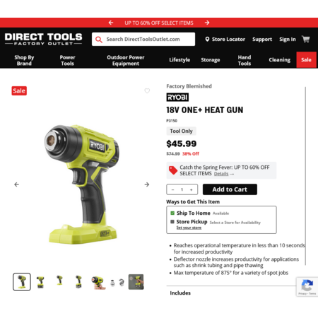RYOBI 18V ONE+ Heat Gun P3150 (Tool Only). Factory Blemished. Free Shipping. $45.99