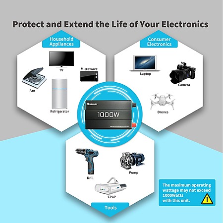 - Conversion: 12V DC to 120V AC Pure Sine Wave, >90% Efficiency.