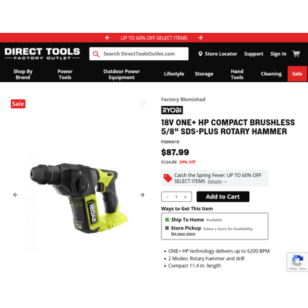 RYOBI 18V ONE+ HP Compact Brushless 5/8" SDS-Plus Rotary Hammer PSBRH01B (Tool Only). Factory Blemished. Free Shipping. $87.99