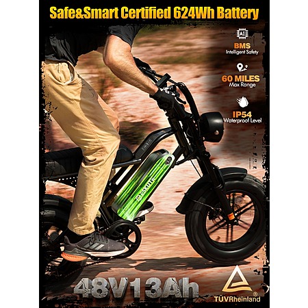 - Battery & Range: 48V 13Ah (624Wh) Removable, up to 60 Mile Range.