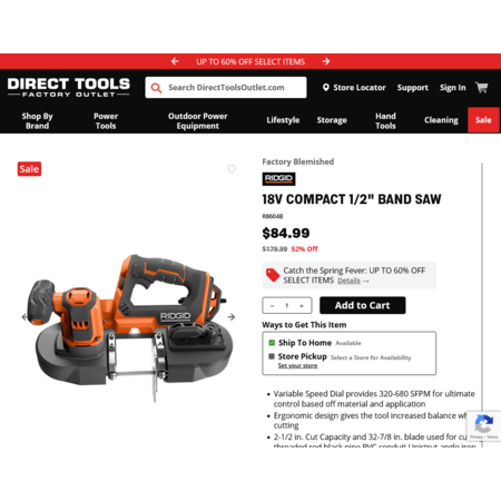 RIDGID 18V Compact 1/2" Band Saw R8604B (Tool Only). Factory Blemished. Free Shipping. $84.99