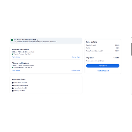 Frontier Airlines, an ultra low-cost, super basic economy airline and Expedia have airfares travelling to and from Houston (IAH) and Atlanta (ATL) for $56, nonstop. Your super low standard airfare will only take you and a personal item from point A to point B. There is no seat selection, no carry-on bag, no seat selection and no change. Slightly lower price if you have Discount Den membership.