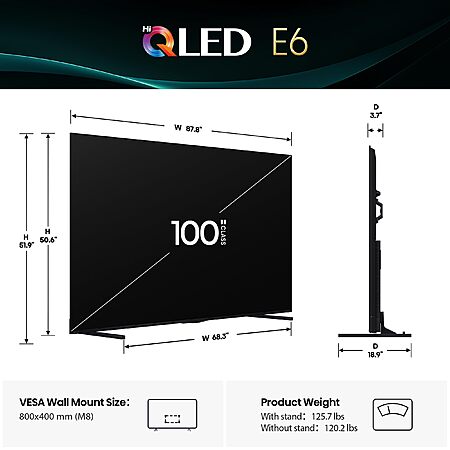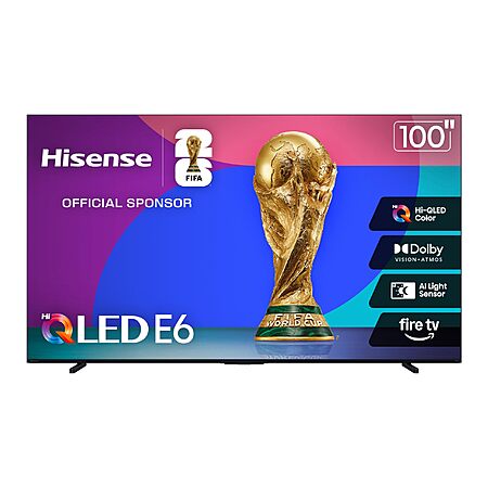 Model: Hisense 100" E6 Cinema Series QLED 4K UHD Smart Fire TV (100E6QF, 2025 Model) - QLED, Native 144Hz, Dolby Vision IQ · Atmos, Motion Rate 240, HDR 10+, Game Mode Pro, Voice Remote with Alexa