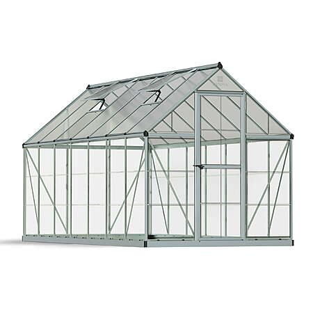| Product Description: | There is something very rewarding about growing your own flowers, herbs, or vegetables, and greenhouses provide the ideal environment to make that happen. The Palram - Canopia Hybrid 6' x 14' Greenhouse combines two types of polycarbonate panels to create a balanced environment for your plants. The translucent polycarbonate roof panels have twice the heat retention of single layer panels and allow the light to reach your plants at all angles while the crystal-clear polycarbonate side panels provide over 90% light transmission and block harmful UV rays. Polycarbonate is a virtually unbreakable polymer that provides the light transmission of glass, but is lighter, stronger, and safer. Palram - Canopia engineers their panels and aluminum frames to be strong, highly resistant to harsh weather and sun, and durable. This attention to detail continues with an integrated gutter system for drainage as well as two roof vents and hinged door to provide airflow and allow adjustment of heat, humidity, and ventilation. The 6' x 14' Hybrid Greenhouse comes as a complete kit and can be quickly and easily assembled. Extend the enjoyment of your growing season and protect your plants from harsh weather and pests with the Hybrid Greenhouse kit from Palram - Canopia! Palram - Canopia Hybrid Greenhouse, 6' x 14', Silver: Virtually unbreakable 4 mm twin-wall polycarbonate roof panels block up to 99.9% of UV rays and diffuse sun light eliminating the risk of plant burn Crystal clear polycarbonate side panels provide 90% light transmission Rust resistant aluminum frame extends 6'-10" from floor to peak Kit Includes two adjustable roof vents, rain gutters, lockable hinged door with magnetic catch, aluminum frame, polycarbonate panels and a galvanized steel base Withstands winds up to 56 mph when combined with the Palram - Canopia Nature Series anchor kit and supports snow loads of up to 15.4 lbs. per sq. ft. Large selection of Palram - Canopia shelving and gardening accessories available for a customized feel 5 year limited warranty and U.S. based customer support Average Set Up Time: 6-8 Hours |