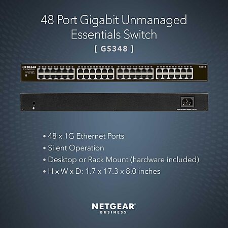 NETGEAR 48-Port Gigabit Ethernet Unmanaged Essentials Switch (GS348) - Desktop or Rackmount, Silent Operation $249.99 at Amazon