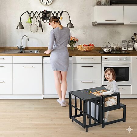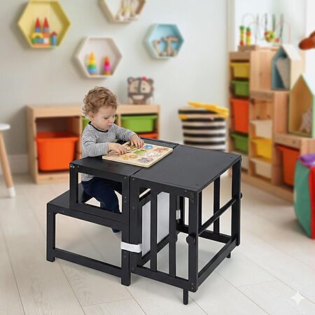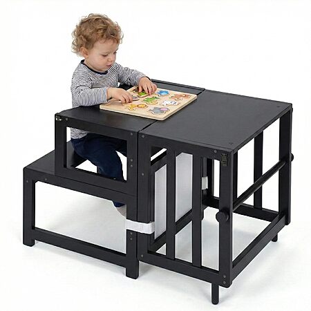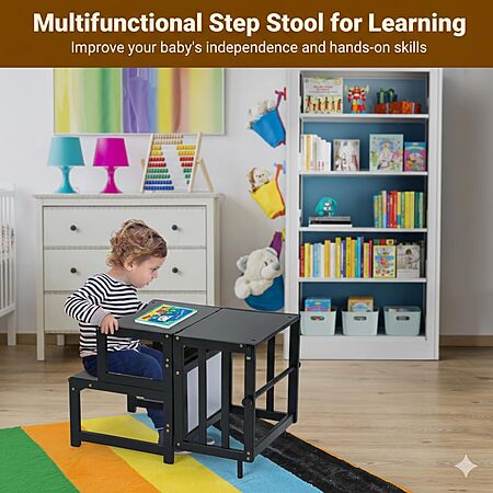 COSYLAND Toddler Kitchen Step Stool - Multifunctional Kids Standing Tower with Safety Rail and Whiteboard (Black or Natural) - $34.99