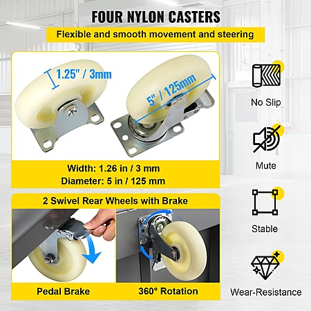 - Wheels: Four 5" (125mm) PU Casters, Two 360° Swivel with Brakes.