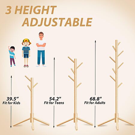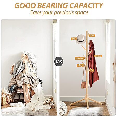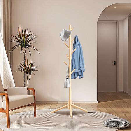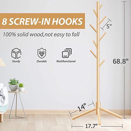 Woot! via Amazon.com has Durable Wooden Coat Rack, Freestanding Coat Rack with Stable Triangular Base, 8 Hooks & 3 Adjustable Heights, Simple Assembly for Bedroom, Hallway, Office(New Nature/Black) on sale for $17.98.