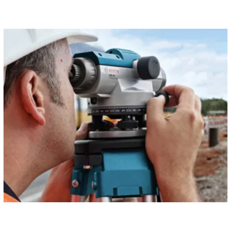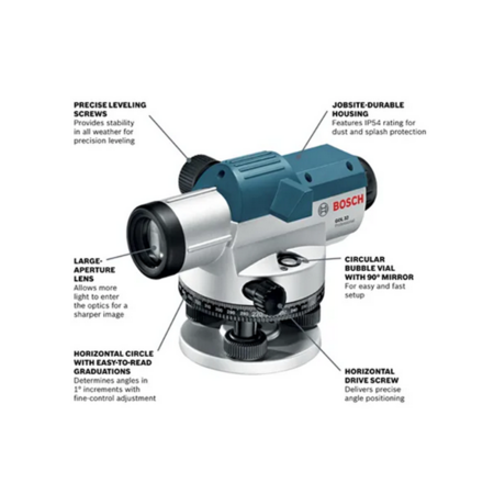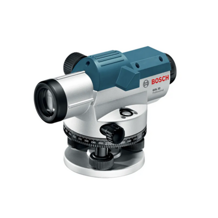 The Bosch GOL 32 automatic optical level features a self-leveling compensator, both horizontal/vertical cross hairs and Stadia lines, 32x magnification lens and large aperture for clear image. Range: 400 Ft., accuracy: up to 1/16 in. at 100 Ft., includes: hard case, lens cap, plumb bob, adjustment tools.