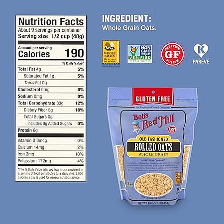 $12.26 | 4-Pack 16-Oz Bob's Red Mill Gluten Free Old Fashioned Rolled Oats at Amazon ($3.06 each)