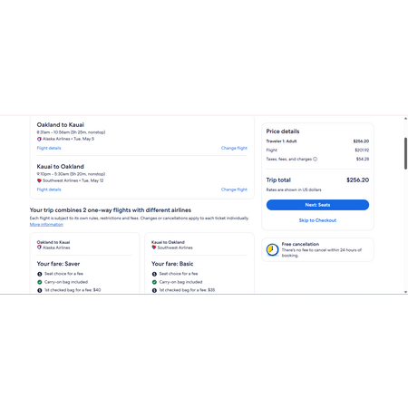American Airlines, Southwest Airlines and Expedia have round trip airfares travelling to and from Oakland CA (OAK) and Kauai Hawaii (LIH) for $257 nonstop. These are basic economy fares that allow a personal item and a carry-on bag. There is no seat selection and no change. If you are travelling with children on American, you will be seated together as per their policy.