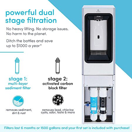 • Patented Dual filters are included with the bottle filler. This consists of a Sediment filter (listed as model Avalon A5FILTER) and a Carbon Block filter (listed as model Avalon A4FILTER) which will last 6 months or 1500 gallons.