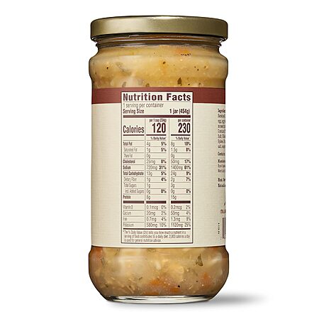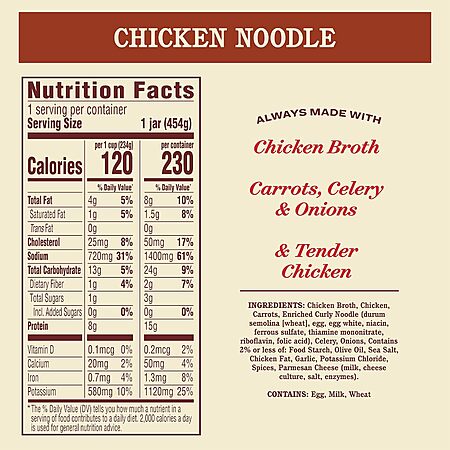 Ingredients: Chicken Broth, Chicken, Carrots, Enriched Curly Noodle (semolina [wheat], egg white, whole egg, niacin, ferrous sulfate, thiamine mononitrate, riboflavin, folic acid), Celery, Onions, Corn Starch, Extra Virgin Olive Oil, Sea Salt, Chicken Fat, Garlic, Potassium Chloride, Black Pepper, Parsley, Oregano, Parmesan Cheese (milk, cheese culture, salt, enzymes).