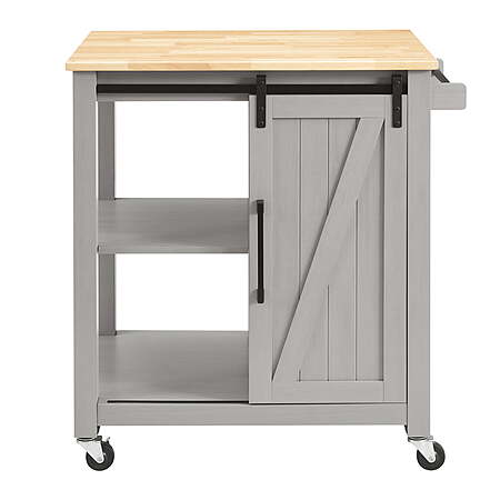 | Product Description: | This dining cart will add an extra serving and storage space to your home. A spacious drawer keeps utensils, silverware, and glassware secure in an enclosed space, closed shelves offer additional storage and there’s a towel hanger that also provides a good hand grip to control the movement of the cart across the kitchen.Four smooth gliding wheels offer free mobility so you can take the accessory wherever you need additional storage or counter space. Two locking casters keep the kitchen trolley firmly in place during food prep. It can be used as a kitchen cart, storage cabinet or entryway console table. With simple and elegant appearance, it complements several decor styles. Perfect for adding extra workspace in your kitchen. Includes one drawer, a cabinet, and three open shelves for holding your cooking supplies, plates, bowls, and more. Thanks to the smooth-rolling wheels, you can move this kitchen cart anywhere. Two locking casters keep the cart in place during food preparation. A thick wood board provides spacious food preparation surface. It can also hold items and adds extra counter space Color: Natural Wood Countertop, Grey Stand Materials: MDF,PB, Metal Assembled Dimensions: 31.5"W x 27.5D" x 36"H Distance Between Shelves: 11'' Item Weight: 80.47 lbs(36.5kg) Customer Service Number: 1-855-597-1828 |