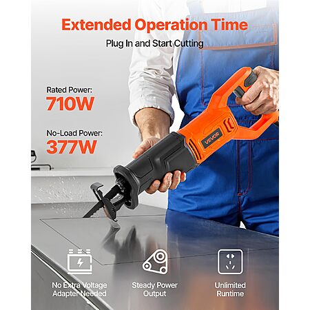 - Plug-and-Play Operation: The AC120V/60Hz corded reciprocating saw for North American mains requires no transformer. Its 710W brushed motor and 377W no-load power deliver steady output and quick response for demanding cuts