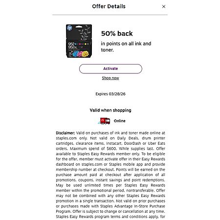 Disclaimer: Valid on purchases of ink and toner made online at staples.com only. Not valid on Daily Deals, drum printer cartridges, clearance items, Instacart, DoorDash or Uber Eats orders. Maximum spend of $600. While supplies last. Offer available to Staples Easy Rewards member only. To be eligible for the offer, member must activate offer in their Easy Rewards dashboard on staples.com or Staples mobile app and provide membership number at checkout. Points will be earned on the purchase amount paid at checkout after application of all promotions, coupons, instant savings and point redemptions. May be used unlimited times per Staples Easy Rewards member within the promotional period, nontransferable. Offer may not be combined with any other Staples Easy Rewards promotion in a single transaction. Not valid on prior purchases or purchases made with Staples Advantage In-Store Purchase Program. Offer is subject to change or cancellation at any time. Staples Easy Rewards program terms and conditions apply, for full program details visit staples.com/easy. Expires 7 days from issuance. 465665.