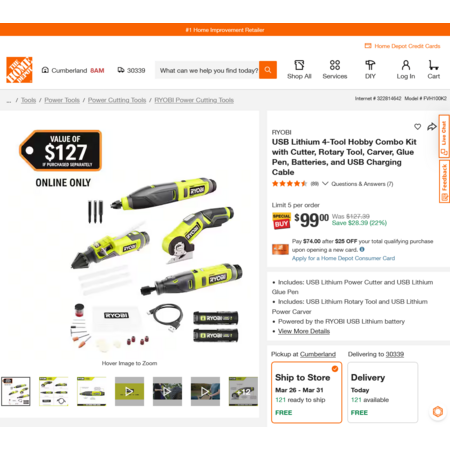 | Product Description: | Enter the RYOBI USB Lithium system with the USB Lithium 4-Tool Combo Kit. Now, crafting has been made more portable than ever. The Power Cutter glides through cardboard, plastic, carpet, rubber and leather with ease. Featuring rapid heat up, the Glue Pen includes a sliding glue lever for maximum precision and control. The Rotary Tool has 15 different accessories and 4X faster accessory changes with the Quick-Change Collet making your various projects faster. First cordless solution of its kind in the industry, the Power Carver allows for controlled carving with 14,000 SPM. This USB Lithium 4-Tool Combo Kit is backed by the RYOBI 2-Year Manufacturer's Warranty and includes (1) FVC51 USB Lithium Power Cutter, (1) FVH56 USB Lithium Glue Pen, (1) FVM51 USB Lithium Rotary Tool, (1) FVH51 USB Lithium Power Carver, (2) USB Lithium 2.0 Ah Lithium Rechargeable Batteries, (1) USB Cable, (1) Straight Chisel, (1) U-Gouge, (1) V-Gouge, (1) Pre-Installed Power Cutter Blade, (15) Rotary Accessories, (1) Wrench, (1) Bit Case, (3) Mini Glue Sticks, (1) Drip Tray Stand, (5) Operator's Manuals. The 4-Tool Combo Kit is a part of the USB Lithium System that provides compact, portable, rechargeable solutions for cordless power and productivity. |