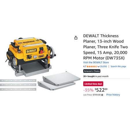 DEWALT Thickness Planer, 13-inch Wood Planer, Three Knife Two Speed, 15 Amp, 20,000 RPM Motor (DW735X) $522