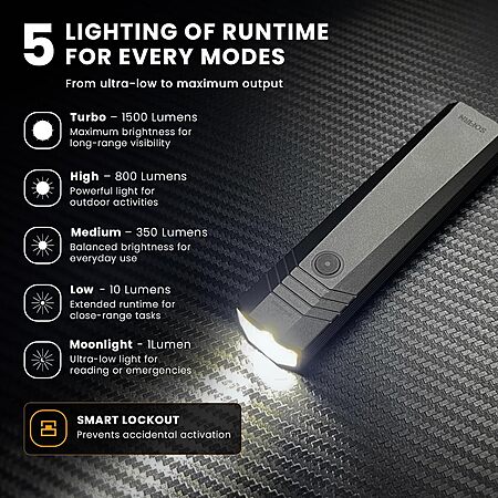 - Max Output: 1500 Lumens (226m beam distance)