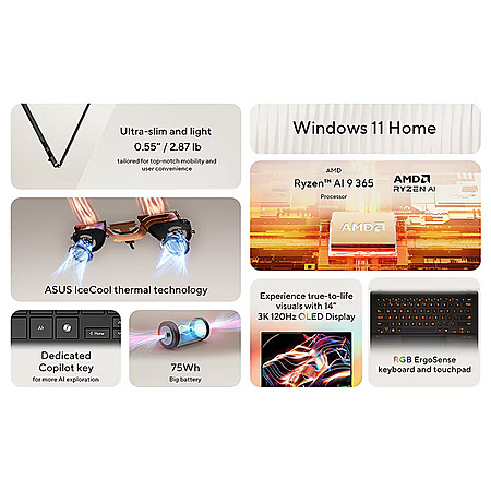 Display: 14-inch ASUS Lumina OLED, 2880x1800 resolution (3K), 120Hz, 0.2ms response, 600-nit HDR, 100% DCI-P3