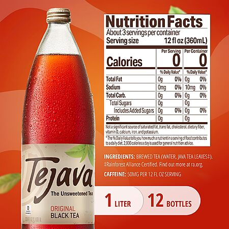 Model: Tejava Original Unsweetened Black Iced Tea, 12 Pack, 1 Liter Glass Bottles, Non-GMO, Kosher, No Sugar or Sweeteners, No calories, No Preservatives, Brewed in Small Batches
