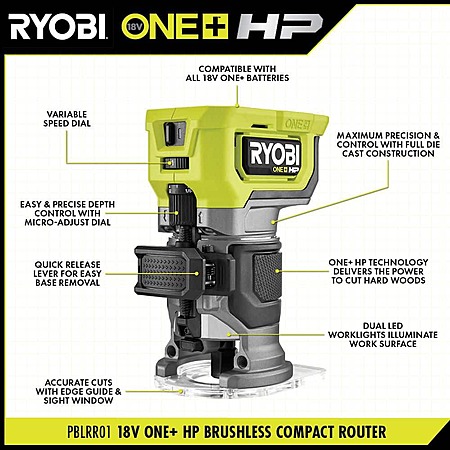 | Product Description: | RYOBI introduces the ONE+ HP 18V Brushless Cordless Compact Router & 5 in. Random Orbit Sander Kit w/ FREE ONE+ 4Ah HIGH PERFORMANCE Battery. The RYOBI 18V ONE+ HP Brushless Compact Router and 5" Random Orbit Sander features ONE+ HP Technology, delivering more power, runtime, durability and speed utilizing brushless motors, advanced electronics and HIGH PERFORMANCE lithium technology. The RYOBI Router provides effortless power as you cut through tough hard woods. The quick release lever allows for easy base removal, while the micro-adjust dial enables precise depth control. With an edge guide and sight window, achieve accurate cuts with confidence. The RYOBI Sander delivers rapid material removal and superior control with its low profile design. Say goodbye to fatigue thanks to a 30% reduction in vibration, allowing you to work longer and more comfortably. Tailor your sanding with the 3 speed control, ranging from 7,000 - 11,000 OPM. Best of all, it is part of the RYOBI ONE+ system where any 18V ONE+ battery works with any 18V ONE+ product. This 18V ONE+ HP Brushless Compact Router and 5" Random Orbit Sander is backed by the RYOBI 3-year manufacturer’s warranty and includes the 18V Brushless Compact Router, 18V Brushless 5" Random Orbit Sander, Edge Guide, Collet Wrench, Vacuum Dust Adaptor, (2) Pieces of Sand paper Assortment, Dust Collection Bag, 4Ah Battery, and Operator's Manuals. Charger sold separately. |