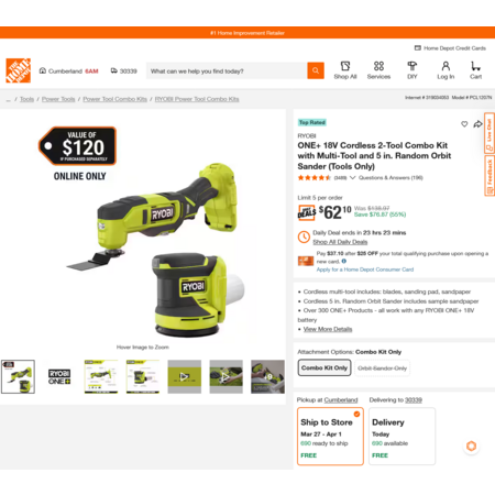 RYOBI ONE+ 18V Cordless 2-Tool Combo Kit with Multi-Tool and 5 in. Random Orbit Sander (Tools Only) $62.10