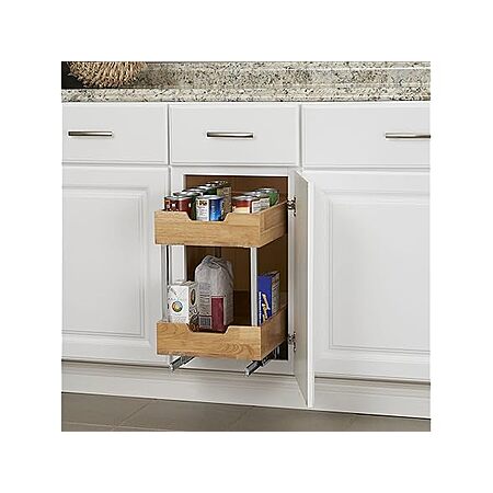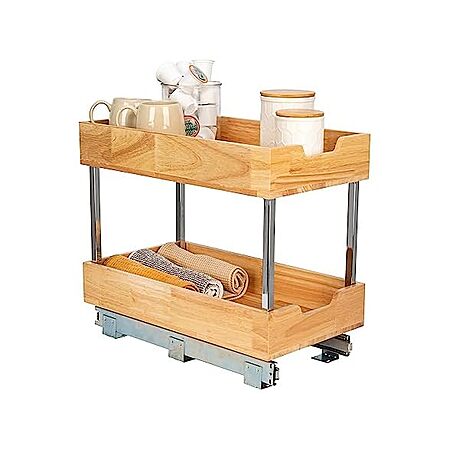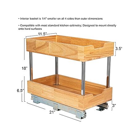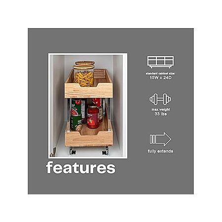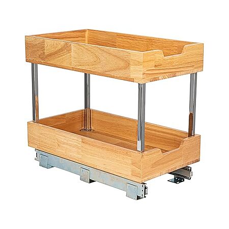 - This cleverly designed, durable steel and natural wood organizer offers 2 tiers of storage space crafted to fit anything from cans and dry goods to cleaning essentials; Equipped with an easy-mount full-extension ball-bearing sliding base
