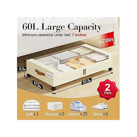 - Space-saving Storage: 30.3"L x 17"W x 6.7"H, offering 60+ liters of capacity. Smooth-rolling wheels make it easy to glide under beds with 6.7" clearance, turning wasted space into useful storage.