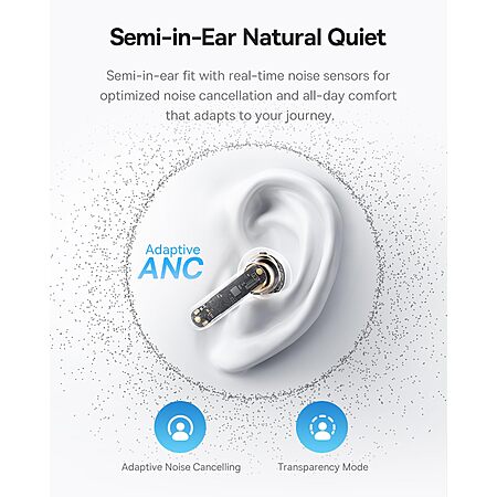 - No More Compromise – True Comfort Meets True Silence: Why choose between comfort and noise cancellation? Our innovative semi-in-ear noise cancelling earbuds brings Adaptive Hybrid ANC without the bulk or ear pressure. Unlike traditional in-ear models, we've engineered a breathable, lightweight fit that seals in silence—not your ears. Perfect for all-day wear, whether you're working, commuting, or relaxing