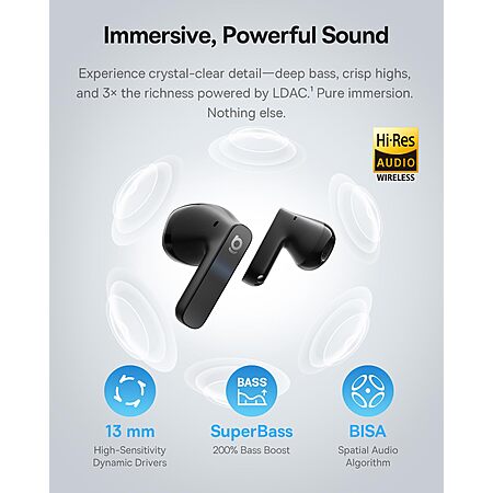 - Hi-Res Audio with LDAC – Hear Every Detail: Experience lossless-quality sound with LDAC technology, transmitting 3x more data than standard Bluetooth. Paired with 13mm dynamic drivers and SuperBass 2.0, your music isn't just heard—it's felt. From subtle harmonies to powerful beats, every genre shines with crisp, rich clarity in these premium Bluetooth earbuds