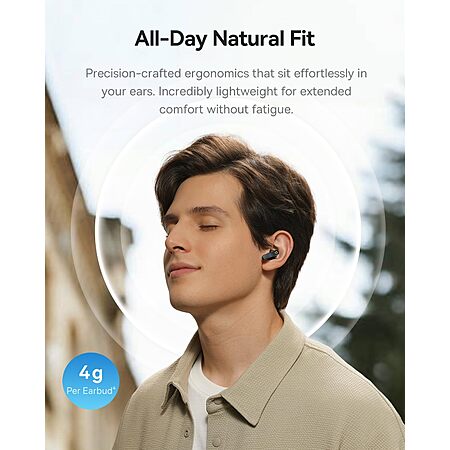 - Feather-Light Design, All-Day Comfort: At just 4g per earbud, it's like wearing nothing. The ergonomic semi-in-ear shape and soft skin-fit material provide a secure yet pressure-free hold. No fatigue, no slipping—just cloud-like comfort through long hours and active moments with these ultra-light anc earbuds