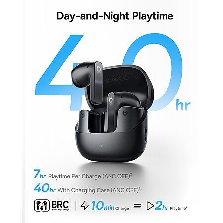 - 40-Hour Power with Speedy Refuel:Get up to 7 hours of playtime on a single charge (ANC off) and 40 total hours with the compact charging case. In a rush? Just 10 minutes of charging delivers 2 hours of playback. Your music stays on, day and night