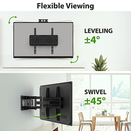 Versatile Motion: Full motion design allows for tilt (5° up, 15° down), swivel (90° left/right), and 4° leveling adjustment for optimal viewing.