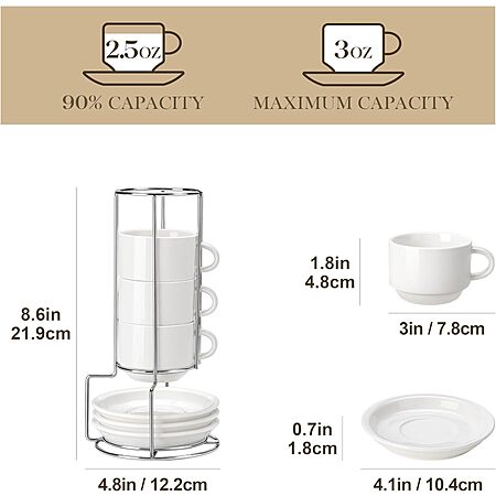 Prime: 4-Count MALACASA 2.5-Oz Porcelain Stackable Cups & Saucers Set w/ Metal Stand (White) $12.99 & More + Free Shipping