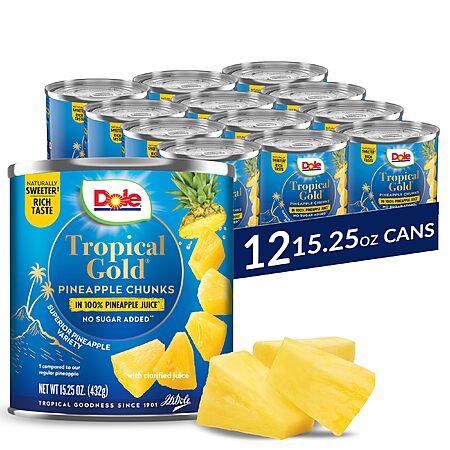 Dole Canned Fruit, Tropical Gold Pineapple Chunks in 100% Pineapple Juice, Gluten Free, Pantry Staples, No Sugar Added, 15.25 Oz, 12 Count~$19.51 After Coupon & S&S @ Amazon