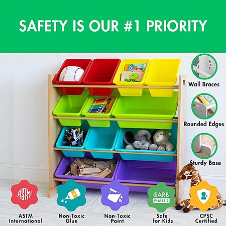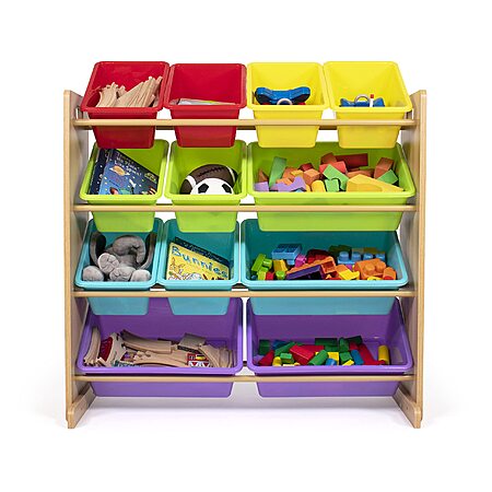 - Playtime is more fun when your kids can easily take out their toys, books and games and then quickly clean up afterwards. The space-saving Humble Crew Rainbow Toy Storage Organizer with 12 Storage Bins stows your children's toys in easy-to-see, easy-to-access BPA and phthalate free plastic storage bins. Playtime is more fun when your kids can easily take out their toys, books and games and then quickly clean up afterwards. The space-saving Humble Crew Rainbow Toy Storage Organizer with 12 Storage Bins stows your children's toys in easy-to-see, easy-to-access BPA and phthalate free plastic storage bins. Stablity Brace and Wall Anchors Removable toy storage bins for playtime and easy clean up. Sturdy engineered wood construction frame reinforced with steel dowels, 30 pound weight capacity per level. 12 durable plastic storage bins, 8 standard and 4 large interchangeable storage bins. BPA and phthalate free. Product sizing— Organizer: 34"W x 11"D (16"D with stabilizing braces) x 31"H, Standard Size Bins: 12"L x 9"W x 6"H, Large Size Bins: 16"L x 12"W x 6"H Stabilizing braces and anti-tip kit provide additional safety support. Anchors to wall for safety. Toy StorageWHAT'S INCLUDED Organizer and 12 Bins Imported Age: 2 years & up 20 lbs per row MDF/Steel/Plastic Some assembly required 34"W x 16"D x 31"H Manufacturer's 90-day limited warranty For warranty information please click here Wipe clean Product weight: 18 lbs.MODEL NUMBERS WO76917 Size: One Size. Color: Multi. Gender: unisex. Age Group: adult.