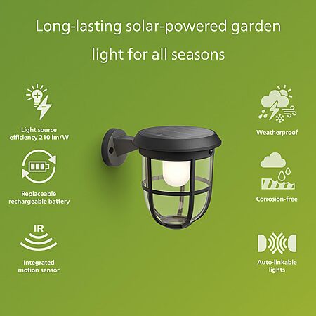 Model: Philips Solar LED 1-Pack Ultra-Efficient Wall Lantern - Radii, Dusk to Dawn, Automatically Linkable, Daylight and Motion Sensor, 3000K Bright White Light, IP44, Black