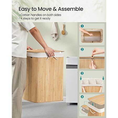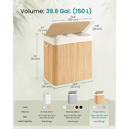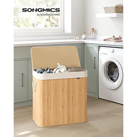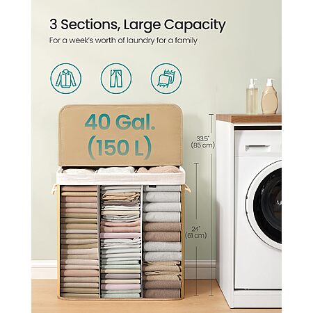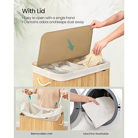 Model: SONGMICS Laundry Hamper, 39.6 Gallons (150L), 3-Section Laundry Basket, Laundry Hamper with Lid, Bamboo, Foldable, Removable and Machine Washable Liner, for Laundry Room, Bedroom, Natural ULCB091N01