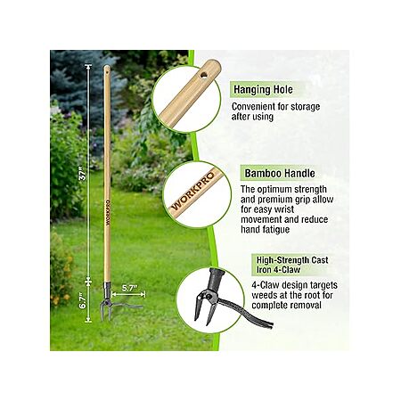 Tired of bending, kneeling, or using harmful chemicals just to get rid of weeds? The WORKPRO 44" Stand-Up Weed Puller is designed to make gardening simple, comfortable, and effective—especially for seniors and those who love pain-free yard work. Featuring a solid, one-piece bamboo handle, this tool offers a natural, ergonomic grip that's smooth, strong, and eco-friendly. Its extra-long 44-inch shaft allows you to weed while standing tall, saving your back and knees from unnecessary strain. At the heart of this tool is a reinforced 4-claw cast iron head, built for strength and durability.