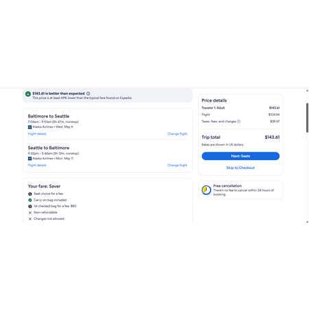 Alaska Airlines and Expedia have round trip airfares travelling to and from Baltimore MD (BWI) and Seattle (SEA) for $144, nonstop. These are saver fares, a restricted-type fare that allows a personal item and a carry-on bag. There is no seat selection and no change. If you are travelling with children, you will be seated together as per Alaska's policy.