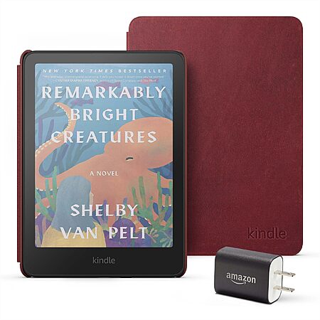 Amazon Kindle Colorsoft Essentials Bundle including Kindle Colorsoft (16 GB) – With color display - Black, Premium Leather Cover-Ruby and Power Adapter $212.97
