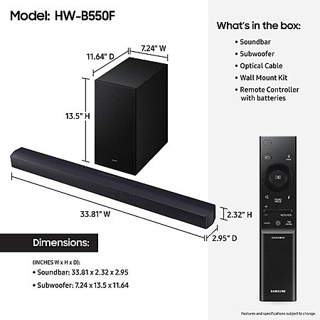 Samsung B-Series Soundbar HW-B550F 2.1 ch DTS Virtual:X Soundbar with Subwoofer (2025 Model) Voice Enhance Mode, Bass Boost, Adaptive Sound $167.99