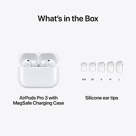 | Product Description: | AirPods Pro 3. Up to 2x more Active Noise Cancellation than AirPods Pro 2.¹ Now with heart rate sensing,² Live Translation,³ longer battery life,⁴ and advancements in hearing health.⁵ Redesigned for a more secure fit.⁴ Legal ¹Testing conducted by Apple in July 2025 using AirPods Pro 3 paired with iPhone 16 with prerelease AirPods firmware and iOS 26. Noise reduction was tested in accordance with IEC 60268-24. Comparison made against the best-selling wireless in-ear headphones commercially available at the time of testing. Performance depends on device settings, environment, and many other factors. ²Built-in heart rate monitor is intended for use during workouts with the Fitness app and compatible third-party apps on iPhone running iOS 26 and later. Refer to support.apple.com/ for more information. ³Live Translation with AirPods works on AirPods 4 with Active Noise Cancellation and AirPods Pro 2 and later with the latest firmware when paired with an Apple Intelligence–enabled iPhone running iOS 26 and later. Supports English (UK, U.S.), French (France), German, Portuguese (Brazil), and Spanish (Spain). For more information, see Feature Availability. ⁴Compared with AirPods Pro 2. ⁵Supported on AirPods Pro 2 and later with the latest firmware when paired with a compatible iPhone or iPad running the latest OS. The Hearing Aid and Hearing Protection features are also supported on Mac running the latest software. See support.apple.com/120850 for total attenuation and more information on the Hearing Protection feature. ⁶Requires an Apple Intelligence–enabled iPhone nearby and Bluetooth headphones with device and Siri language set to English. Apple Intelligence is available in beta. Some features may not be available in all regions or languages. For feature and language availability and system requirements, see support.apple.com/en-us/121115. ⁷Apple Intelligence is available in beta. Some features may not be available in all regions or languages. For feature and language availability and system requirements, see support.apple.com/en-us/121115. ⁸Testing conducted by Apple in July and August 2025 using preproduction AirPods Pro 3 with MagSafe Charging Case paired with preproduction iPhone 17 Pro units, all with prerelease software. The playlist consisted of 358 unique audio tracks purchased from the iTunes Store (256-Kbps AAC encoding). Volume was set to 50% and Active Noise Cancellation was enabled. With Spatial Audio and Head Tracking enabled, listening time was up to 7.5 hours. Testing consisted of full AirPods Pro battery discharge while playing audio until the first AirPod Pro stopped playback. Battery life depends on device settings, environment, usage, and many other factors. ⁹Testing conducted by Apple in July and August 2025 using preproduction AirPods Pro 3 with MagSafe Charging Case paired with preproduction iPhone 17 Pro units, all with prerelease software. Both volume and amplification level were set to 50% and Transparency was enabled. Testing consisted of full AirPods Pro battery discharge with the Hearing Aid feature on, with no audio playing back from iPhone, until the first AirPod Pro was fully discharged. Battery life depends on device settings, environment, usage, and many other factors. ¹⁰The Hearing Test feature is supported on AirPods Pro 2 and later with the latest firmware paired with a compatible iPhone or iPad with iOS 18 or iPadOS 18 and later, and it is intended for people 18 years old or older. ¹¹The Hearing Aid feature has received FDA authorization. This feature is supported on AirPods Pro 2 and later with the latest firmware when paired with a compatible iPhone, iPad, or Mac with iOS 18, iPadOS 18, or macOS Sequoia and later, and is intended for people 18 years old or older with perceived mild to moderate hearing loss. ¹²Supported on AirPods Pro 2 and later with the latest firmware when paired with a compatible iPhone running the latest software. This feature may not be available in all regions or all languages. View complete list. ¹³The Hearing Protection feature works with AirPods Pro 2 and later with the latest firmware when paired with a compatible iPhone, iPad, or Mac with iOS 18, iPadOS 18, or macOS Sequoia and later. The feature is not available in all regions or all languages. View complete list. See support.apple.com/120850 for total attenuation and more information. The Hearing Protection feature is not suitable for protection against extremely loud impulse sounds, such as gunfire, fireworks, or jackhammers, or against sustained sounds louder than 110 dBA. ¹⁴Requires an Apple Account and a compatible Apple device running the latest operating system software. ¹⁵Requires a compatible Apple device running the latest operating system software. Technical specifications Go to apple.com/airpods-pro/specs/ for a complete set. |