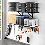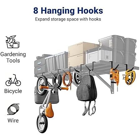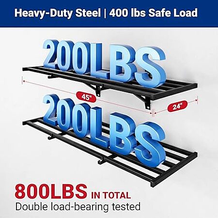Model: FLEXIMOUNTS 2x4ft Heavy Duty Garage Wall Shelving, 2-Pack Garage Shelving Wall Mounted with 8 Hooks, 400lbs Capacity, Storage for Power Tools, Garden Supplies, Storage Bins