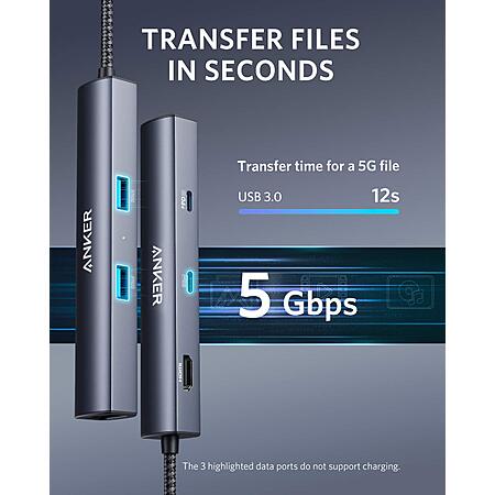 USB-C and USB-A data ports provide file transfer at speeds up to 5 Gbps, while an HDMI port supports media display at resolutions up to 4K@30Hz.