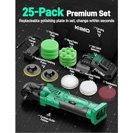 Model: KIMO 20V Cordless Buffer Polisher Kit, 24 Accessories, 2 X 2000mAh Batteries, Car Polisher w/ 6 Variable Speed Up to 3634RPM, Cordless Polisher for Car Detailing/Waxing/Polishing/Scratch Removing